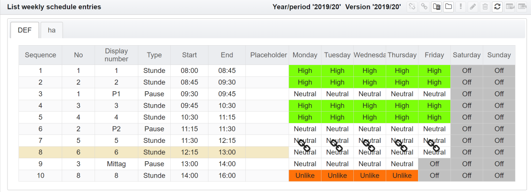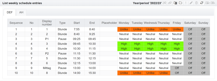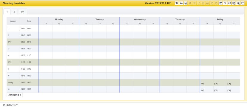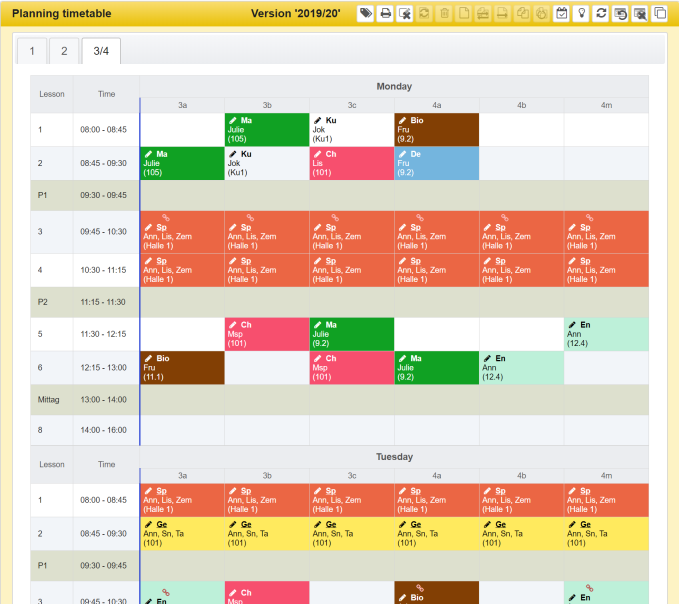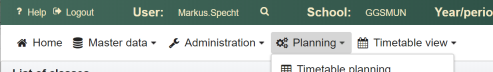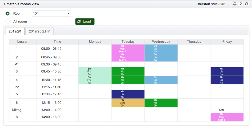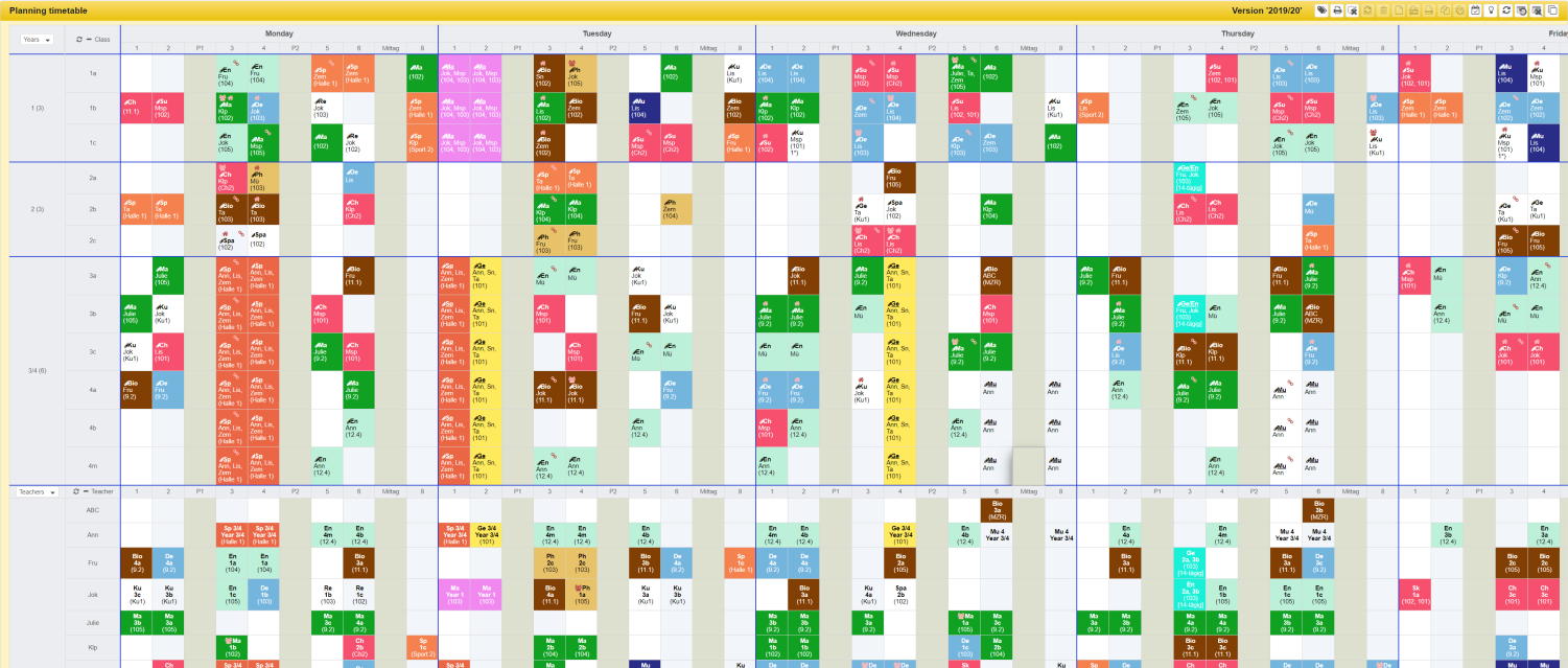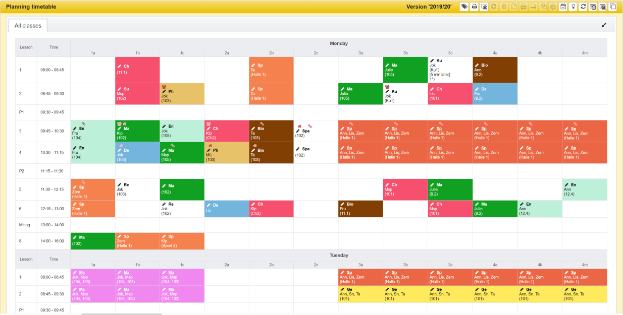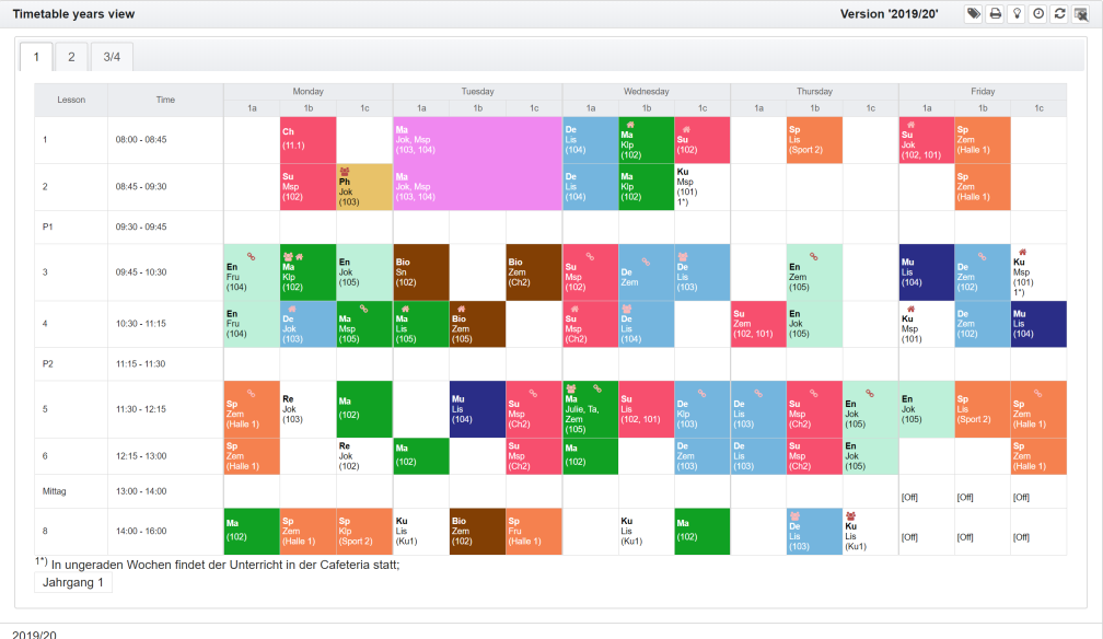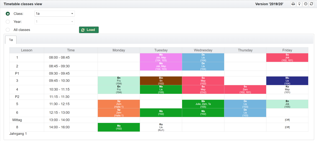 Showing the timetables for classes, teachers or rooms is essentially the same. It is explained below using the example of the view for a class.