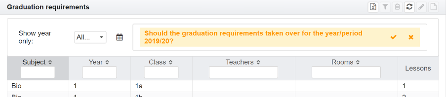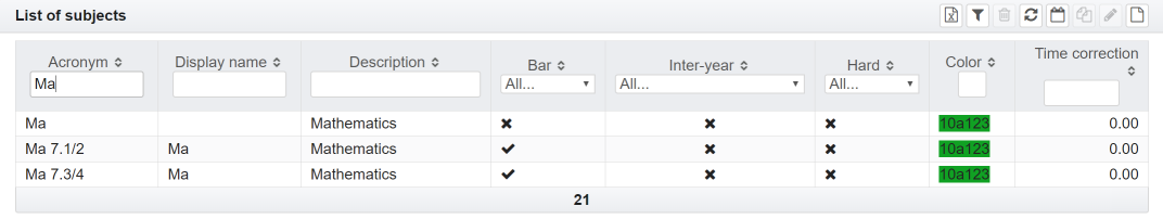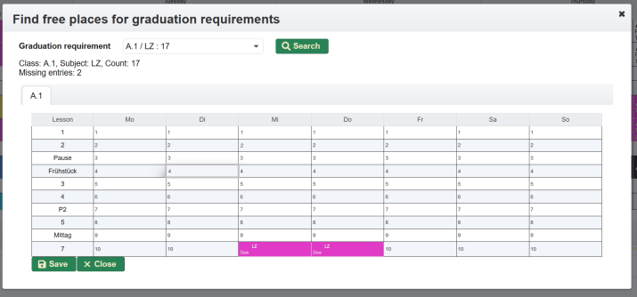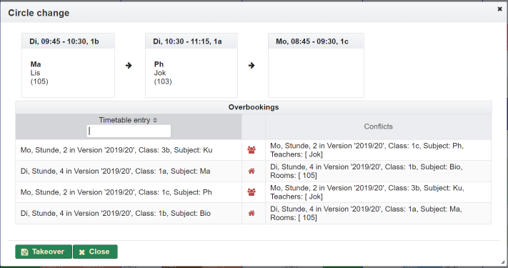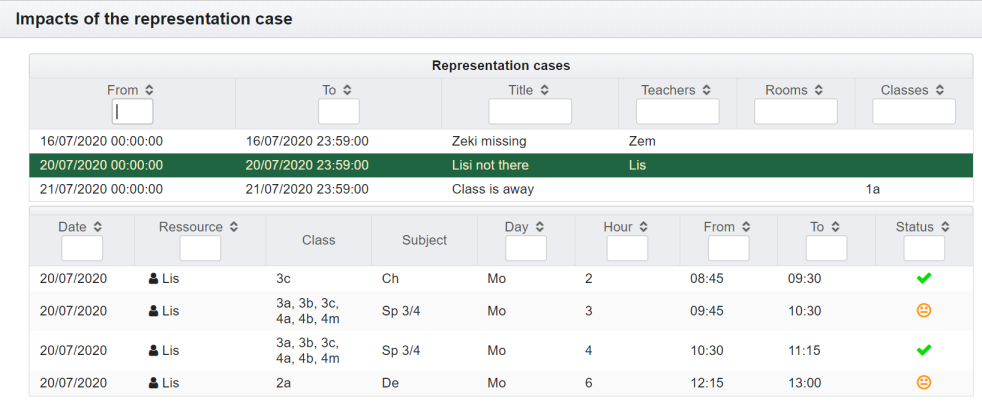 - a class is not there | Klasse | List of affected class | Fach | Affected subject | Tag | Day the event effects | Stunden | Lesson or break the event effects | Von/Bis | Time span of the lesson | Status | Processing status