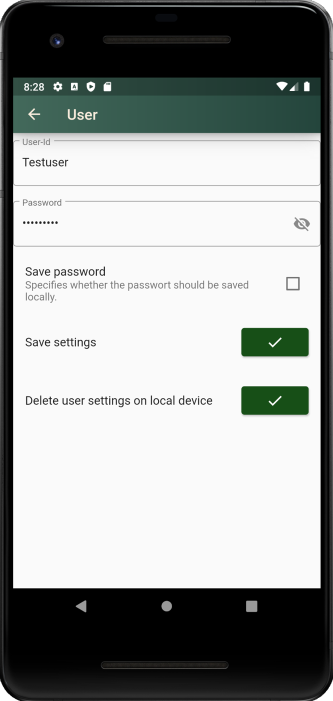 Username and password can be saved in the local area at the Smartphone/Tablet, so that this data does not have to be re-entered every time.