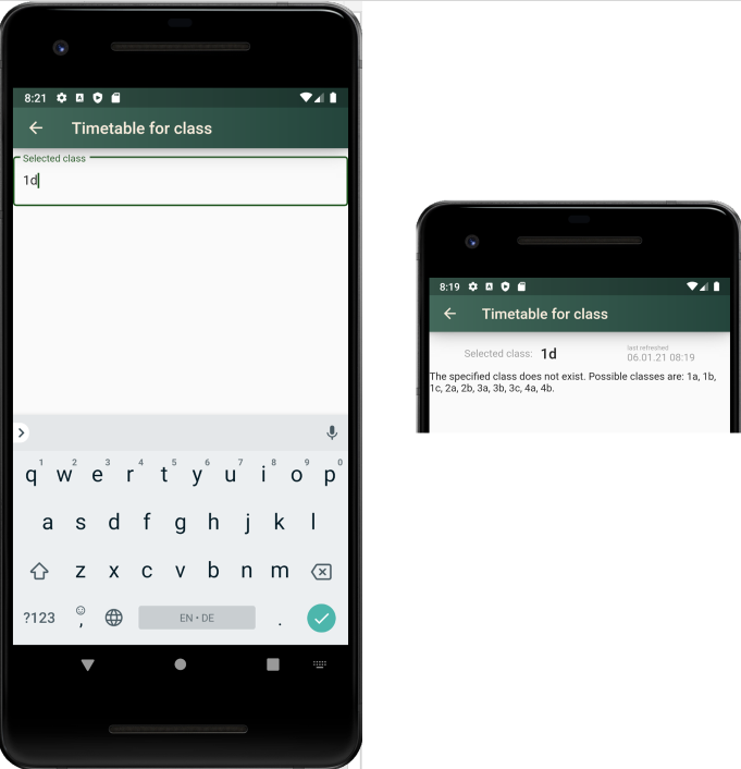 If a timetable has never been called up, you will first be asked for the desired class (teacher or room). If the entered class (the room or the teacher) does not exist, a message appears with suggestions as to which classes might be suitable.