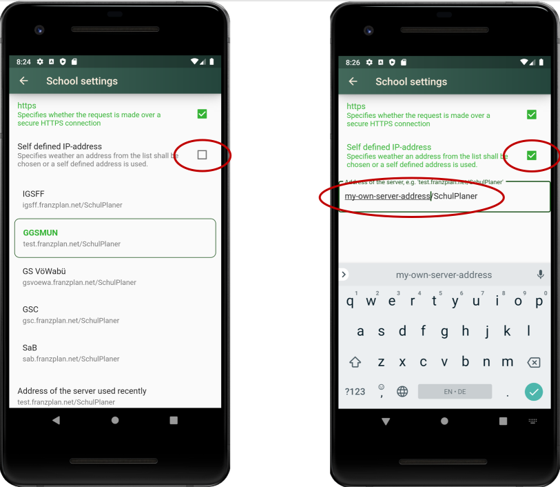 Here the address of the school server can be selected directly from the list of available entries. If the school server does not appear in the list, it is possible to enter the address manually. This will be Check the box for Self-defined IP address and adjust the text field Address of the server that is actually used accordingly.