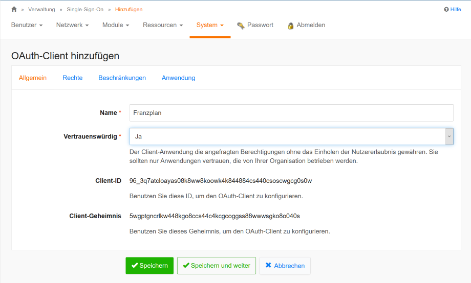 The client ID and client secret are preassigned. Both entries must be adopted in the configuration from the Franzplan and each with the entries for spring.security.oauth2.client.registration.iserv.client-id and spring.security.oauth2.client.registration.iserv.client-secret have to match.