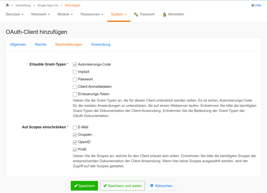 at Restrict scopes choose the checkbox for groups openid and profil.