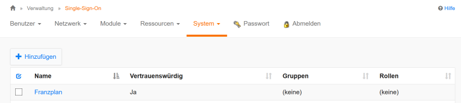 Administrator rights are required in IServ so thatto be able to carry out the configuration of Single Sign On (SSO). To do this, select the System menu item underAdministration and here again Single sign-on.