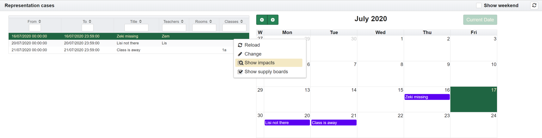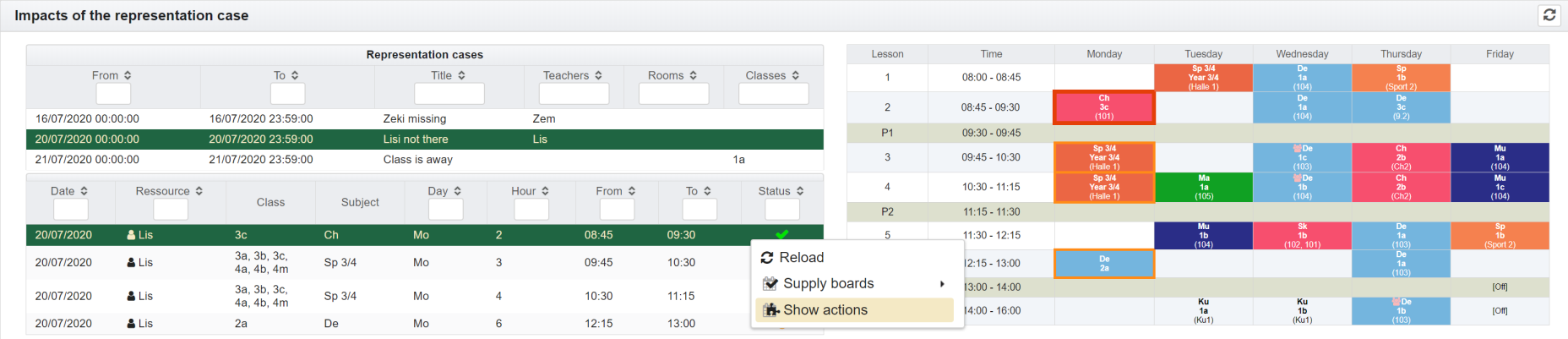 Marking an impact causes the impact to be displayed in the timetable. In addition, you can then select various activities with the right mouse button.