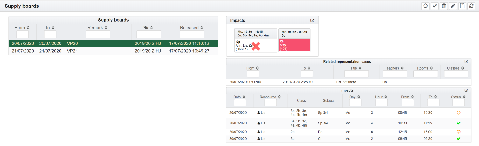 Ultimately, the substitute planning is displayed on the basis of released supply boards. These can be displayed and released in this view. To do this, mark the corresponding entry in the list of supply boards.